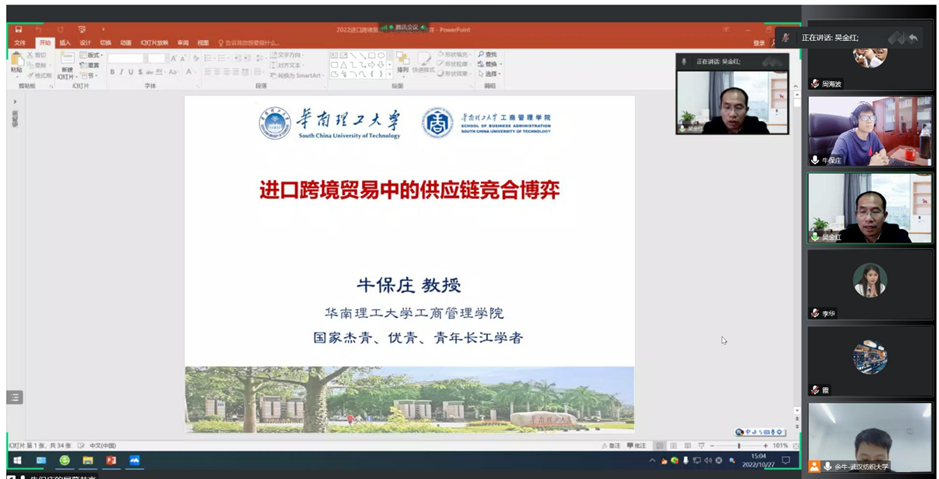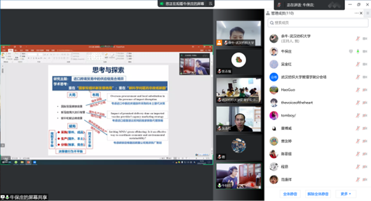 近日,应beat365官方网站邀请,华南理工大学工商beat365官方网站牛保庄教授为beat365官网师生带来了一场精彩的线上学术讲座,讲座题目为“进口跨境贸易中的供应链竞合博弈”。本次讲座由beat365官方网站余牛教授主持,吴金红院长出席并致辞,beat365官网相关领域教师与研究生积极参与讨论。