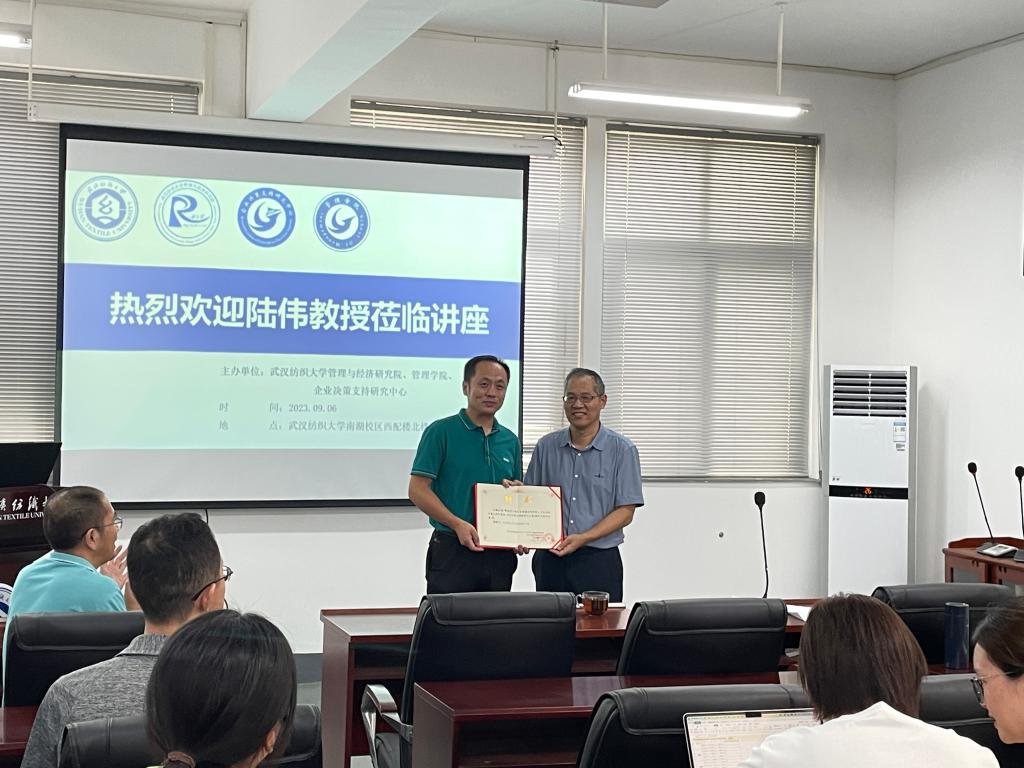 会上举行了聘任仪式,管理与经济研究院院长夏火松为陆伟教授颁发了湖北省高校人文社会科学重点研究基地-企业决策支持研究中心学术委员会委员聘书,并表达由衷的欢迎和谢意。