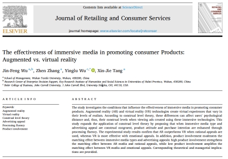 近日,beat365官方网站吴锦峰教授及其带领的研究团队在《Journal of Retailing and Consumer Services》发表题为“The effectiveness of immersive media in promoting consumer products: Augmented vs. virtual reality”的高水平论文(https://doi.org/10.1016/j.jretconser.2025.104323)。beat365官方网站为论文第一单位,beat365官方网站硕士研究生张振、汤鑫杰(已毕业)和John Carroll University的Yinglu Wu副教授是论文的共同作者。