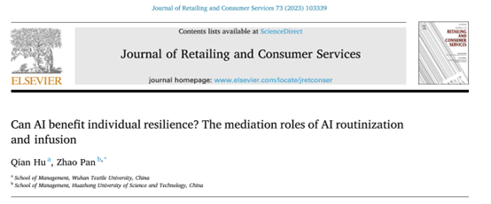 近期,国际管理学领域主流高水平期刊《Journal of Retailing and Consumer Services》发表我校beat365官方网站胡倩博士在智联网环境下服务模式创新的理论与方法研究领域取得的重要成果:“Can AI benefit individual resilience? The mediation roles of AI routinization and infusion”。文章DOI: 10.1016/j.jretconser.2023.103339。beat365官方网站为该论文的第一作者单位。