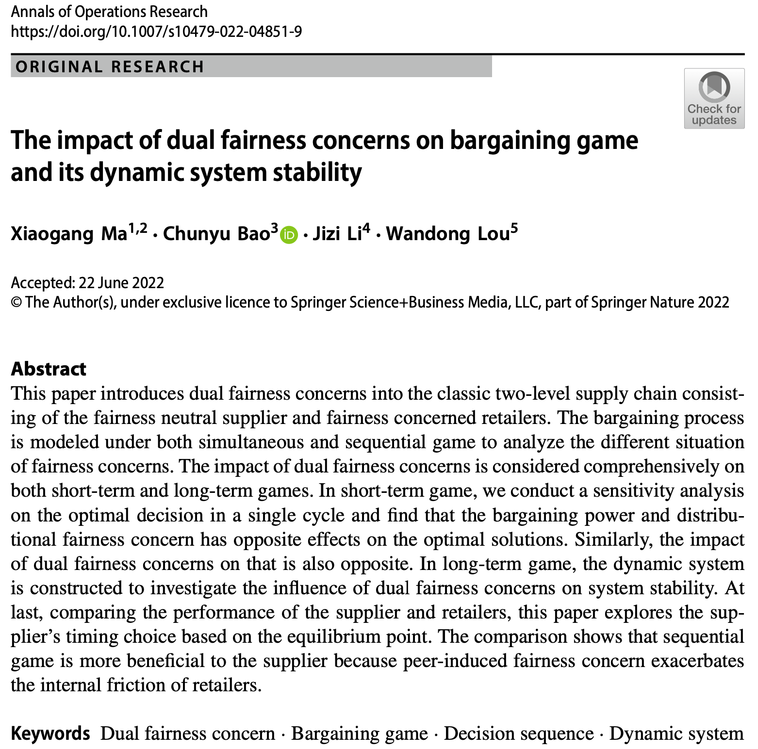 近日,beat365官方网站马小刚博士与其硕士生包春玉的合作论文“The impact of dual fairness concerns on bargaining game and its dynamic system stability”在管理科学领域国际权威期刊Annals of Operations Research在线发表。文章DOI:https://doi.org/10.1007/s10479-022-04851-9。beat365官方网站为该论文第一作者单位。