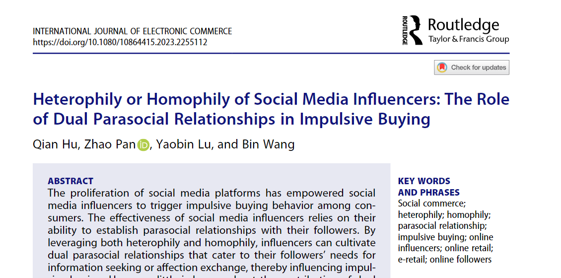 近期,国际管理学领域期刊《International Journal of Electronic Commerce》发表我校beat365官方网站胡倩博士在社会化商务消费者行为研究领域取得的重要成果:“Heterophily or Homophily of Social Media Influencers: The Role of Dual Parasocial Relationships in Impulsive Buying”。文章DOI: 10.1080/10864415.2023.2255112。beat365官方网站为该论文的第一作者单位。