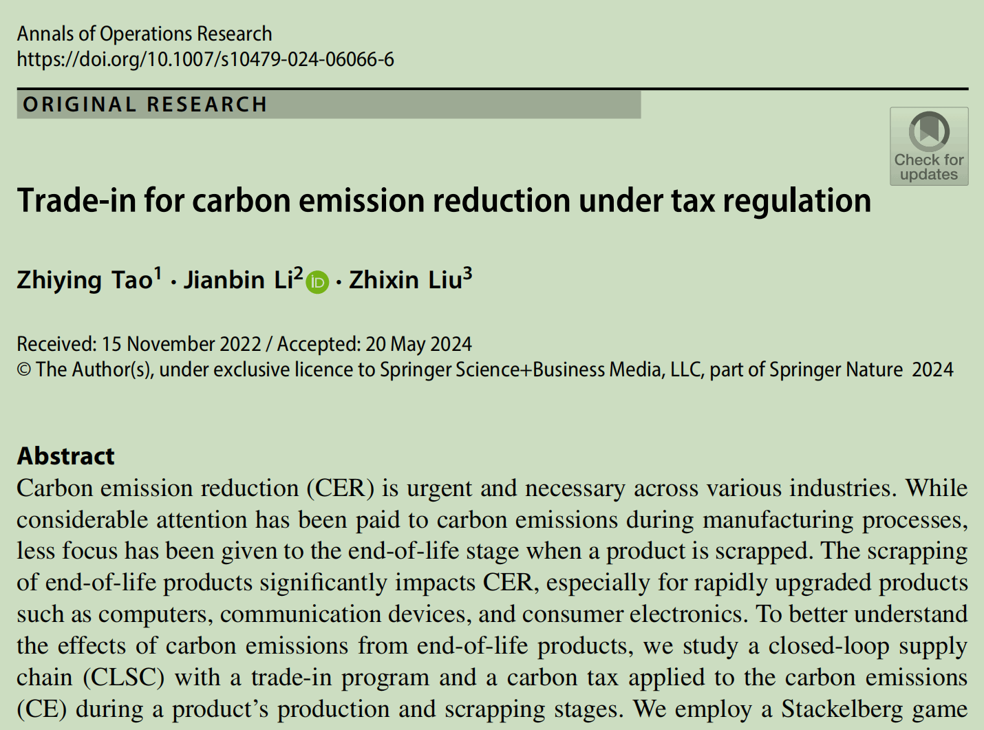 近期,管理学国际期刊《Annals of Operations Research》发表我校beat365官方网站陶智颖博士在低碳供应链运营管理相关领域取得的研究成果:“Trade-in for carbon emission reduction under tax regulation”(文章DOI:10.1007/s10479-024-06006-6)。beat365官方网站为该论文的第一作者单位。