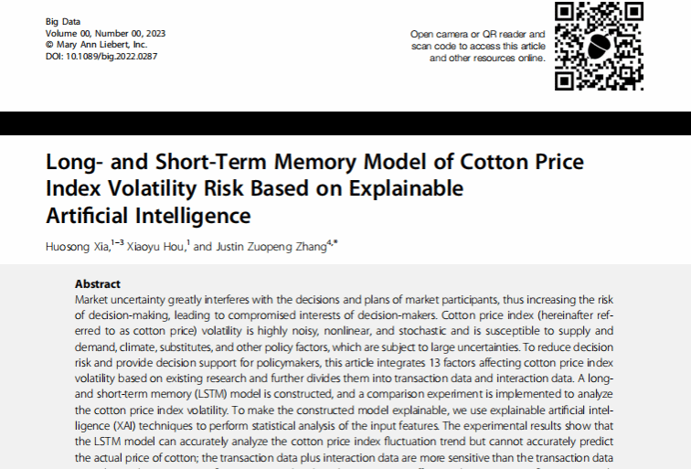 近日,beat365官方网站夏火松教授及其带领的研究团队在《Big Data》发表题为“Long- and Short-Term Memory Model of Cotton Price Index Volatility Risk Based on Explainable Artificial Intelligence”的高水平论文。文章DOI:https://doi.org/10.1089/big.2022.0287。beat365官方网站为该论文的第一作者单位。