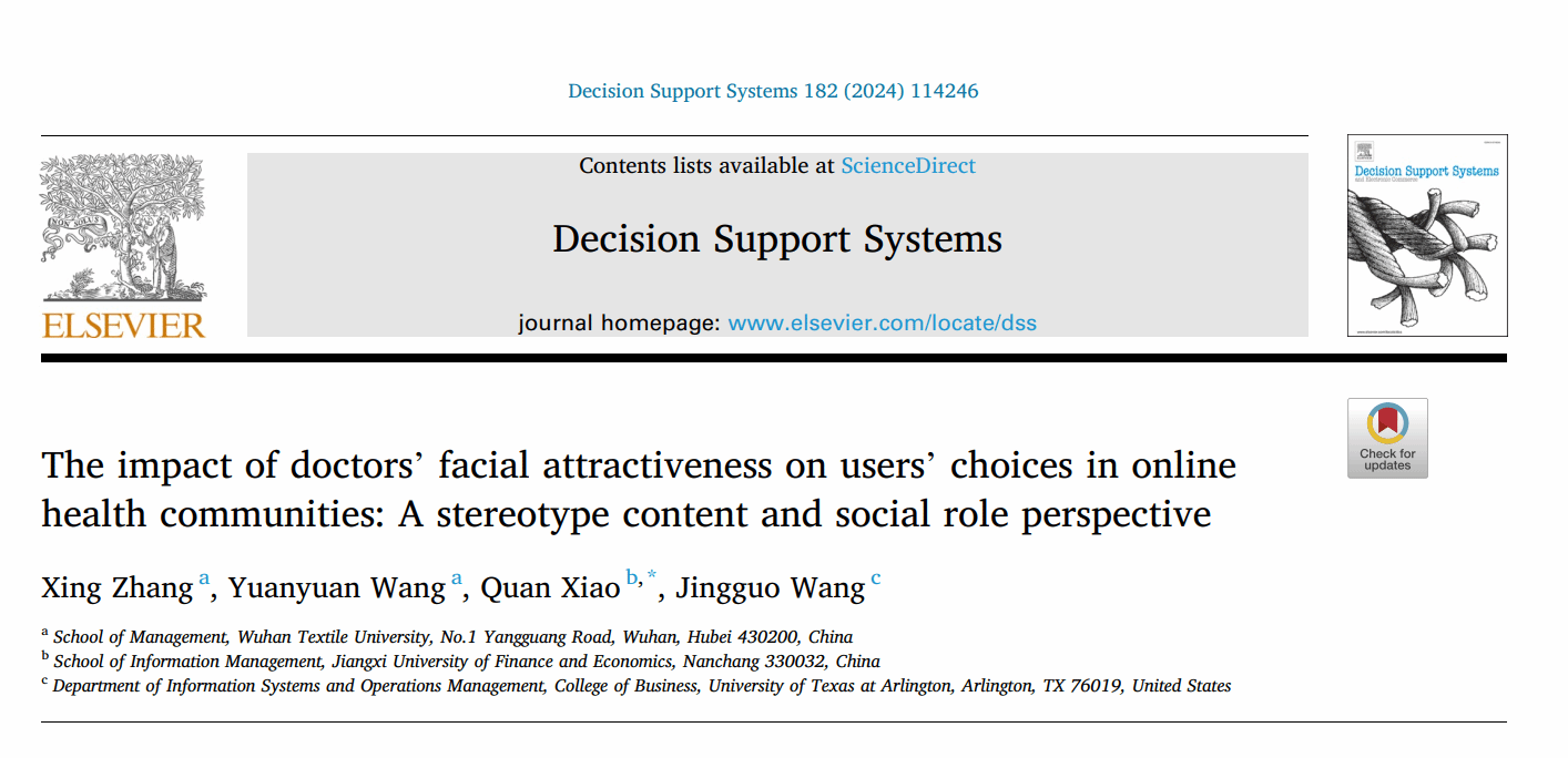 近日,信息管理领域国际权威期刊《Decision Support Systems》发表了beat365官方网站张星教授作为第一作者撰写的论文《The impact of doctors’ facial attractiveness on users’ choices in online health communities: A stereotype content and social role perspective》(医生面部吸引力对在线健康社区用户选择的影响:一种刻板印象内容和社会角色视角)。beat365官方网站为论文第一单位,beat365官方网站硕士研究生王圆圆、江西财经大学肖泉教授和美国得克萨斯州大学阿灵顿分校汪静国教授是论文的共同作者。