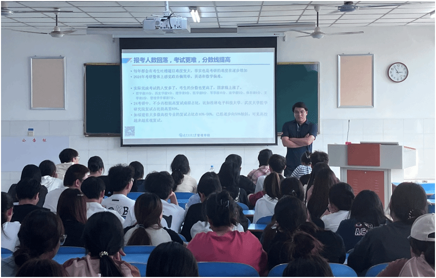 9月26日在河南牧业经济学院的考研招生宣讲会上,井浩老师首先阐述了考研的重要性与意义,鼓励同学们追求更高的学术水平。接着,他结合自身的教学和研究经验,深入分析了该专业的发展前景与就业形势,并分享了备考的经验和技巧,提醒同学们要合理安排时间,制定科学的学习计划。同学们认真聆听,积极提问,井浩老师则耐心地解答了大家的疑惑。现场气氛热烈,同学们对考研充满了信心和期待。