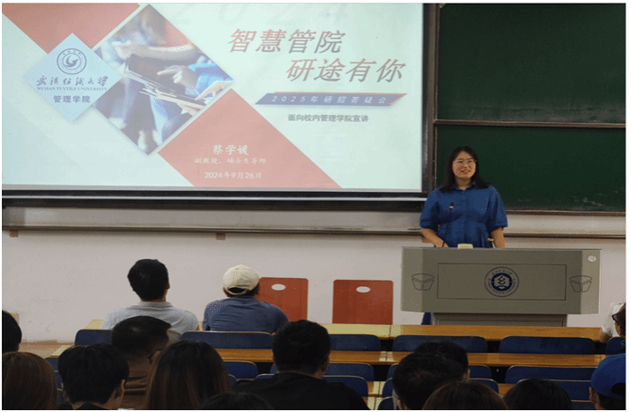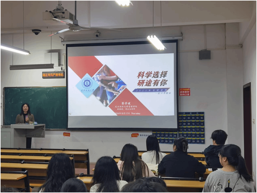 10月17日在汉口学院的考研招生宣讲会上,蔡学媛老师从研究生报名注意事项、备考锦囊、院校和专业选择三个方面进行了介绍,提供大量的往届毕业生考研数据为同学们的选择提供参考,推荐了考研冲刺复习的技巧和方法。同时,她向同学们介绍了学院的研究生招生计划,欢迎大家将beat365官方网站纳入考研选择目标。