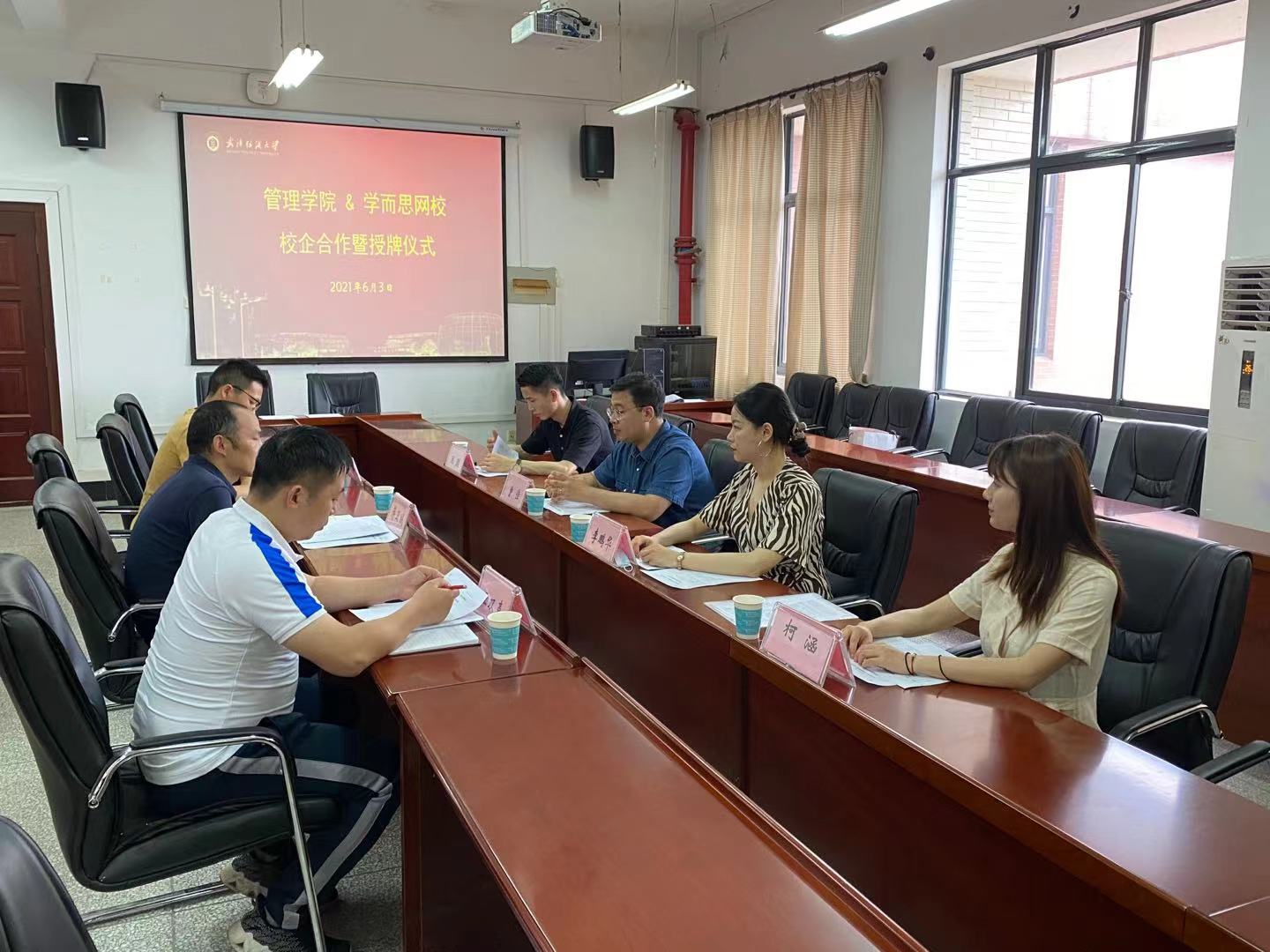 6月3日下午,beat365官方网站与学而思网校武汉分校在崇德楼536会议室举行了校企合作签约暨揭牌仪式。学而思网校武汉分校政委曾佳一行4人,学院党委副书记蒋卫城及辅导员出席签约仪式。
