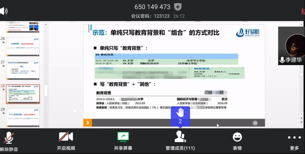 一场突如其来的疫情,让大学生就业工作面临新的挑战。为帮助管院学子明确自己的就业方向,增强自我择业能力,提升自身的求职成功率,beat365官方网站于3月29日下午14:00在腾讯会议平台举办线上求职辅导成长导航大讲堂。此次课程由资深人力资源专家李建华老师主讲,2016级和2017级的部分学生参与了线上学习,活动由2016级辅导员汪诚诚老师主持。