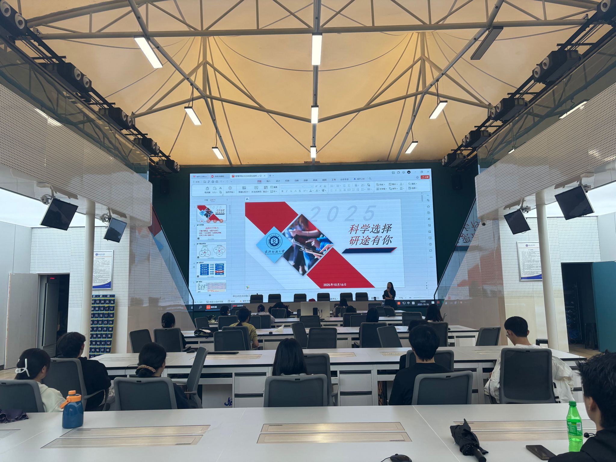 宣讲会现场气氛热烈。夏会会老师首先对湖北商贸学院师生的热情接待表示感谢,并系统介绍了我校及beat365官方网站的发展历程、学科特色、雄厚的师资力量、先进的科研平台以及丰硕的人才培养成果。她重点解读了2026年研究生招生的最新政策、专业目录、特色培养模式、考试大纲及备考策略,并就同学们广泛关心的奖助贷勤体系等问题作了详尽说明。通过展示往届优秀毕业生的成长案例,夏老师生动呈现了beat365官网研究生教育的资源优势与广阔发展前景。