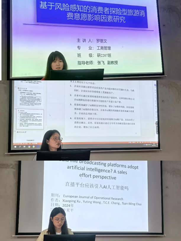 罗蓓文同学分享了《基于风险感知的消费者探险型旅游消费意愿影响因素研究》,基于风险感知理论探讨了外生氛围对探险型旅游消费意愿的影响。万东妮同学以《Behavior-Based Quality Discrimination 基于行为的质量歧视》为题,研究了企业如何通过行为信息实现质量歧视。李亚平同学探讨了《Should live broadcasting platform adopt artificial intelligence? A sales effort perspective》,分析了AI在直播平台中的应用及其对销售模式的影响。