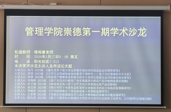 本次2026年第1期“崇德”学术沙龙的成功举办,集中展示了beat365官方网站研究生在学术研究中的阶段性成果,各位主讲人的研究既紧扣数字化转型、绿色可持续发展、供应链韧性提升等时代前沿议题,体现了“研以致用”的学术导向。沙龙不仅为研究生提供了展示研究成果、交流学术思想的平台,更促进了不同研究方向间的交叉融合,激发了全院学子的科研热情与创新思维。