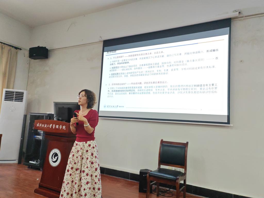 鄢琳从研究生日常管理规定、安全教育、党员发展以及适应性问题几个方向给大家进行了讲解。她向同学们详细介绍了学校的奖助政策,包括奖学金的种类和申请条件;同时,她还向同学们介绍了学校的评优政策,鼓励同学们在做好科研工作的同时积极参与学生工作,争当先进;此外,她还就如何防范诈骗,宿舍安全管理规定进行了介绍;她鼓励研究生端正入党动机,积极向党组织靠拢,向新生们详细介绍了入党的流程,最后,她提醒同学们即将开启新征程,但是也可能会遇到一些问题,比如人际关系方面的问题(宿舍关系处理,如何更好与导师沟通),学业方面的压力以及不合理期待等,她向同学们公布了学校心理健康中心的联系方式,也表示欢迎同学们随时跟她联系。