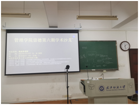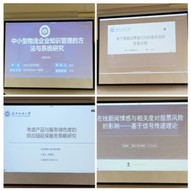 在会场二中,首先分享的是来自20级物流的赵起同学,介绍题为《中小型物流企业知识管理的方法与系统研究》的研究,本文将知识管理和共享的理念引入企业内部管理中,建立一个能够实现知识管理和共享的系统,以提高知识的流转和转换效率,基于知识螺旋理论设计测量问项进行问卷调研,通过对统计结果进行分析,了解企业知识管理建设情况,以及对系统使用的满意程度,为系统后续的改进和企业的知识管理建设提供依据。随后是来自20级物流的许可沁同学,汇报主题为《基于策略消费者行为的最低团购数量决策》,在市场需求与消费者对产品估价均为随机变量情况下,建立厂商最低团购数量和消费者临界评价值的理性预期均衡模型,研究厂商如何制定合适的最低团购数量以应对策略消费者的持币观望行为,指出厂商团购限量策略的适用范围,并与不限量的厂商决策进行比较。来自20级物流的徐歌晨同学,介绍了论文《考虑产品与服务绿色度的供应链延保服务策略研究》,文章同时考虑产品绿色度与服务绿色度的影响,运用博弈论等相关理论,构建不同延保服务供应链决策模型,探讨企业的延保服务供应链最优产品与服务定价决策、最优产品与服务绿色度决策、最优延保服务提供商决策。最后一位分享者是来自21级的田雅其同学,在她的论文《在线新闻情感与相关度对股票风险的影响——基于信号传递理论》中,该研究探索现代科技给金融带来的影响,从新闻与股票关联度的角度出发去探究新闻关联度大小对股市风险的波动的影响,以框架理论和信号传递理论为基础,采用金融科技方法分析网络新闻情绪,提出新闻关联度对股市风险的产生影响的相关假设。