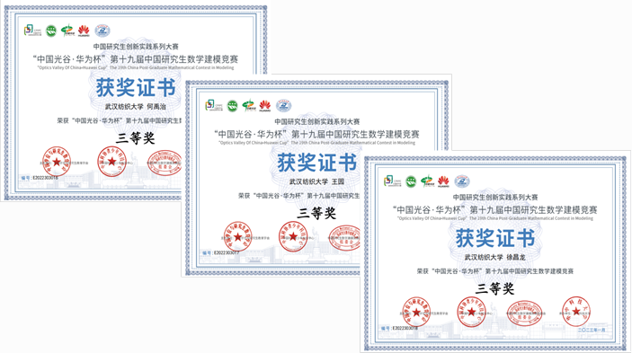 奋斗时不我待,努力只争朝夕。新年伊始,夏火松教授团队再传来喜讯。2020级研究生徐昌龙、王园、何禹治在指导老师夏火松教授的指导下,荣获中国研究生创新实践系列大赛“中国光谷·华为杯”第十九届中国研究生数学建模竞赛三等奖。