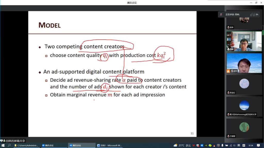 会议伊始,吴金红院长作致辞,对田林教授的到来表示热烈欢迎,随后,主持人余牛教授介绍了田林教授主要研究方向和学术成果。田林教授以视频广告为背景,简介了数字内容市场概况,表明其市场近年来在急剧增长,许多平台(如You Tube、Twitch和Instagram)在平台观看内容时显示广告,他们与内容创造者分享广告收入,以鼓励他们创建和分享内容。这些平台通常采用统一的广告格式(即平台显示相同数量的广告,而不考虑内容质量)或差异化的广告格式(即平台基于内容质量显示广告数量)。