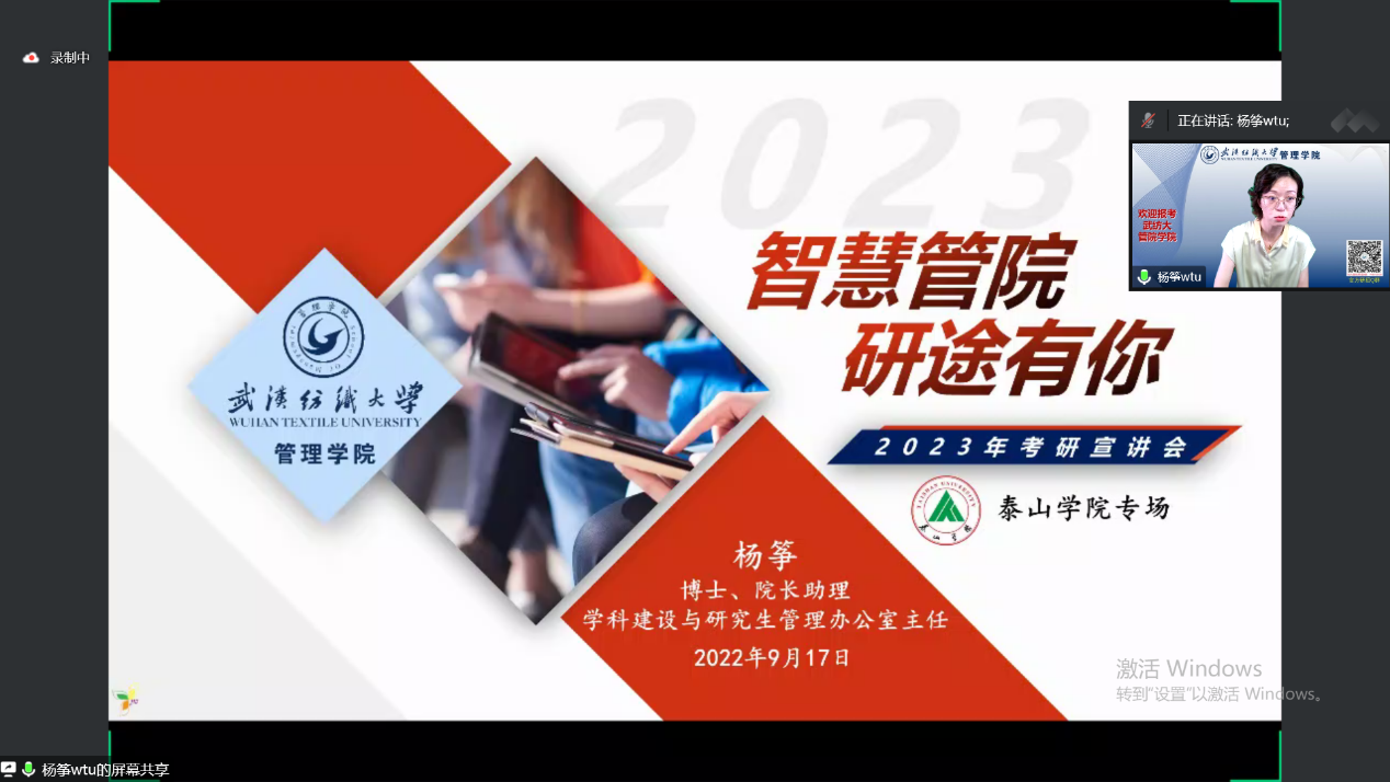 2022年9月17日,beat365官方网站杨筝博士为泰山学院举办了线上考研宣讲,考研上岸的优秀研究生徐瑞杰,李继华也作了心得分享。