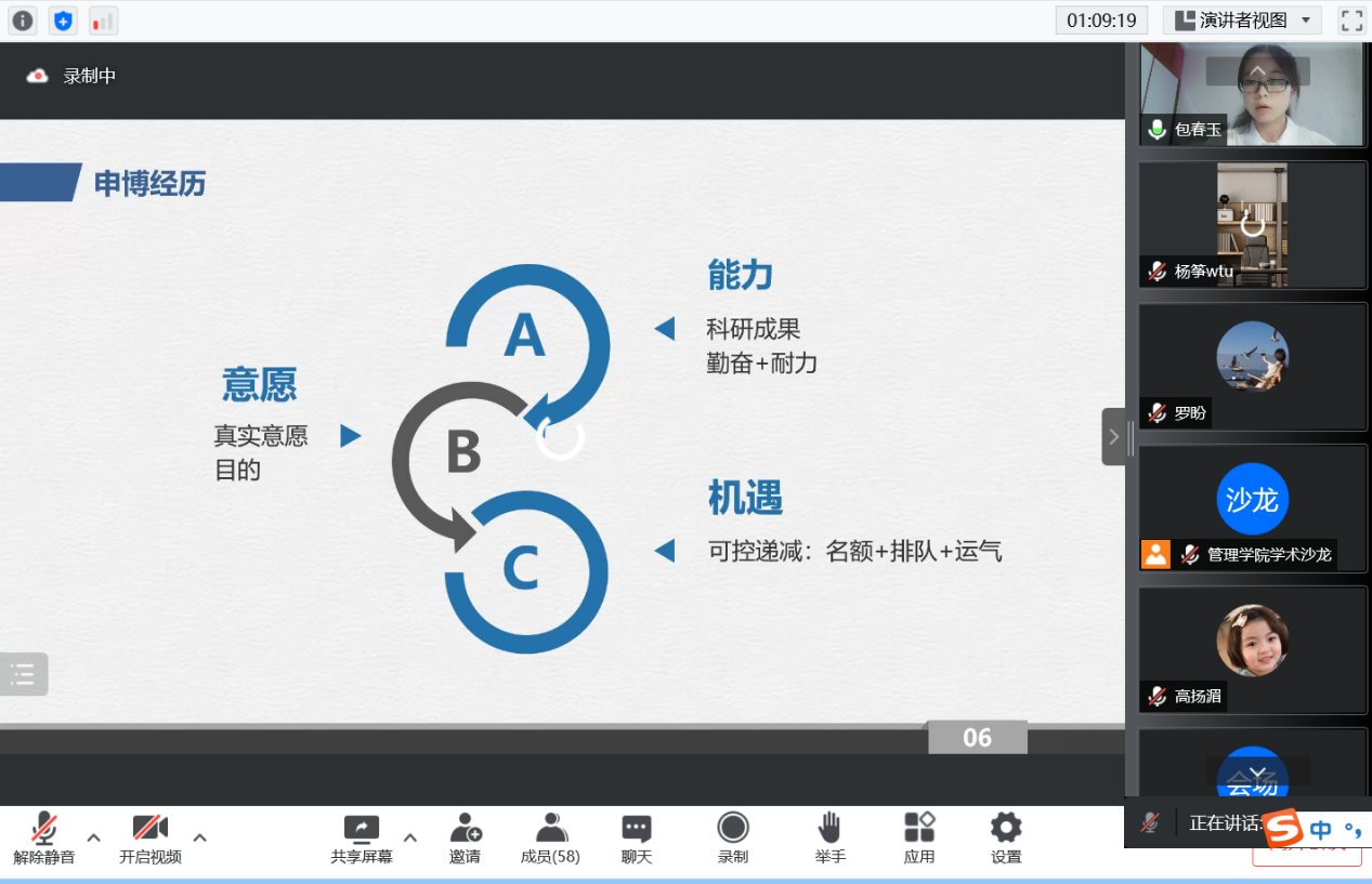 会上,杨筝博士对包春玉表示了热烈欢迎。同时,勉励同学们考博要落到今天、落到实处、落到具体,了解目标院校的报考或申请条件。此外,杨筝博士结合自身求学经历,建议大家尽早着手准备,注重平时的积累,丰富自己的知识储备。并鼓励大家在硕士期间多发表高水平论文,做好科研工作。