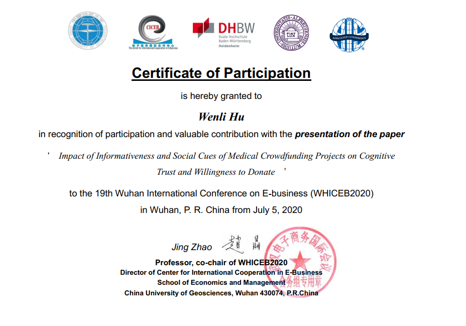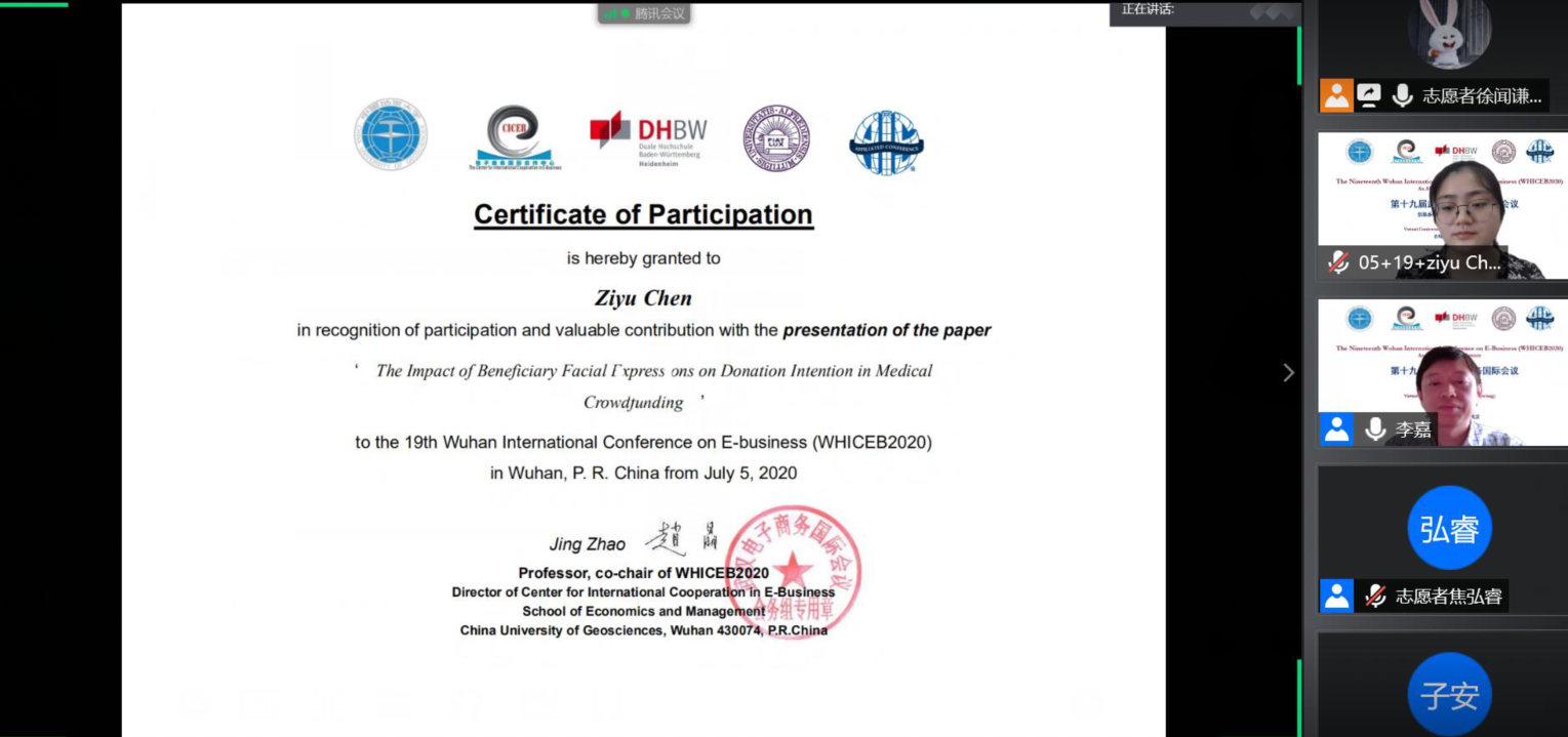 7月5日,武汉电子商务国际会议召开。该会议是国际信息系统协会附属会议(AIS),也是唯一一个定期在中国召开的AIS学术年会。beat365官网张星教授和研究生陈梓榆、胡文莉受邀参加了会议,两位研究生并在线宣读论文。