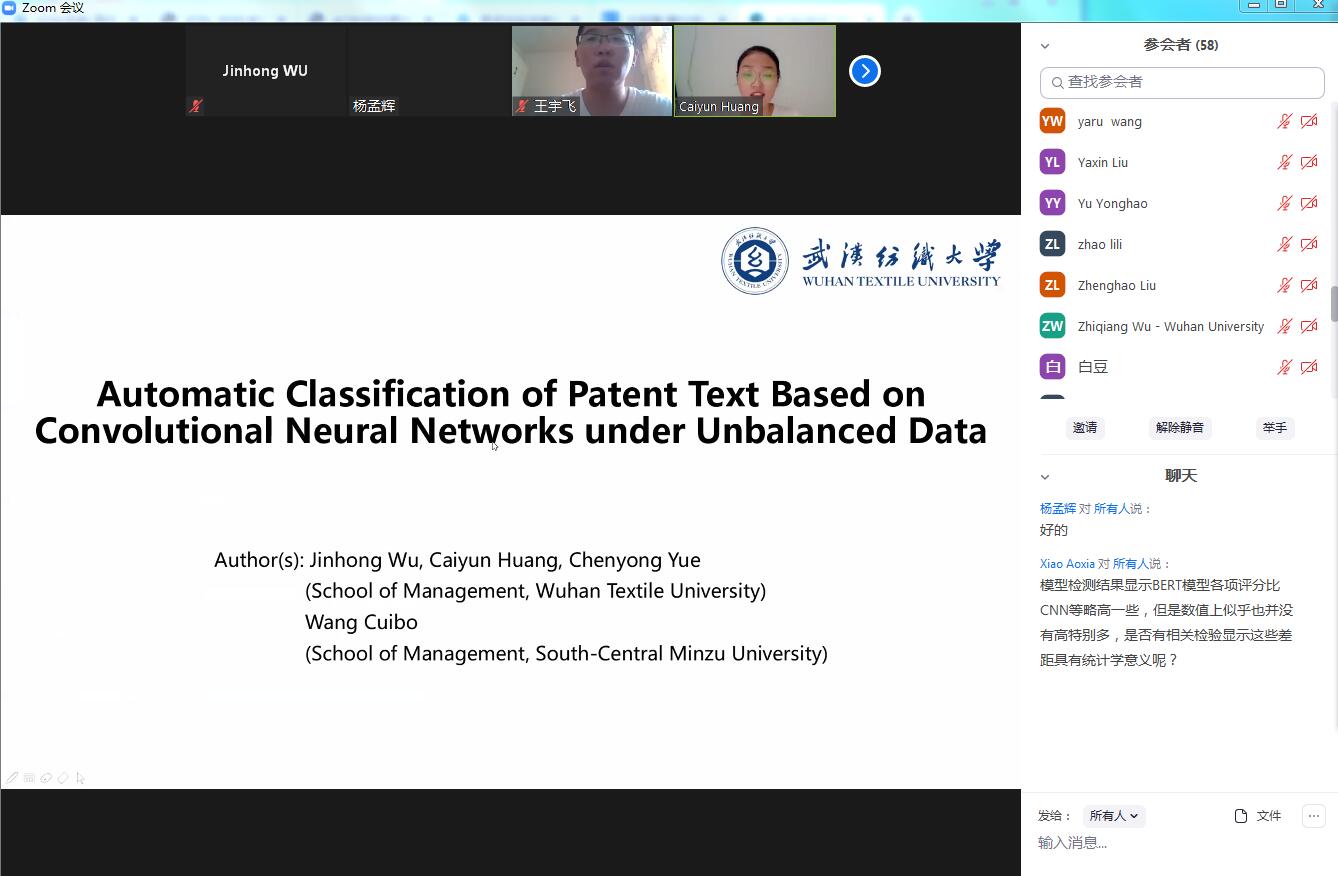 8月5日,beat365官网吴金红教授、陈勇跃教授和研究生黄彩云参加了ACM/IEEE数字图书馆联合会议(Joint Conference on Digital Libraries,JCDL)(JCDL 2020)。研究生黄彩云宣读了题为《Automatic Classification of Patent Text Based on Convolutional Neural Network Under Unbalanced Data》的最新研究成果。在数据不均衡的情况下,研究团队通过各种欠采样、过采样以及综合采样的方法来均衡数据后,利用卷积神经网络进行专利文本自动分类研究,探究非均衡数据自动分类的影响因素及相关解决方案。